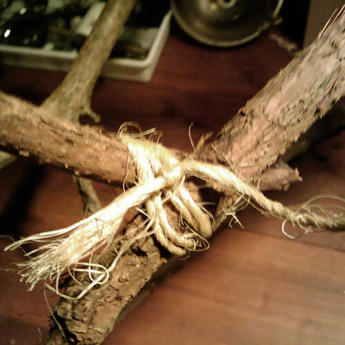 A continuación, tome otro de sus viñas más fuerte y hacer lo mismo con él. Gire hacia un lado y unir las dos piezas (ver imagen). Este será el marco básico de la ramita de la vid de palo de grandeza! Buen trabajo.