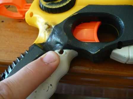 Saque el tornillo en la parte superior del mango, después de este paso probablemente no podrá volver a utilizar este agujero. (ver fotos adicionales).