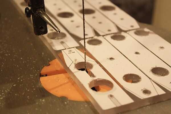 Usando una Sierra caladora o Sierra de marquetería hacer el corte interno en el pedazo de captura que conecta los agujeros de diámetro 5/8" y 5/32".