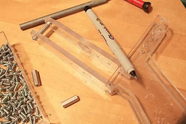 Conecte juntos los pedazos FRAME1 y FRAME2 con longitud tornillos de #6-32 3/8" y 3/4" largo hexagonal espaciador. Insertar y alinear en el conjunto de agarre parcial como se muestra, luego con un sharpie punto fino para marcar a ambos lados de las piezas como se muestra para indicar la alineación de los agujeros.