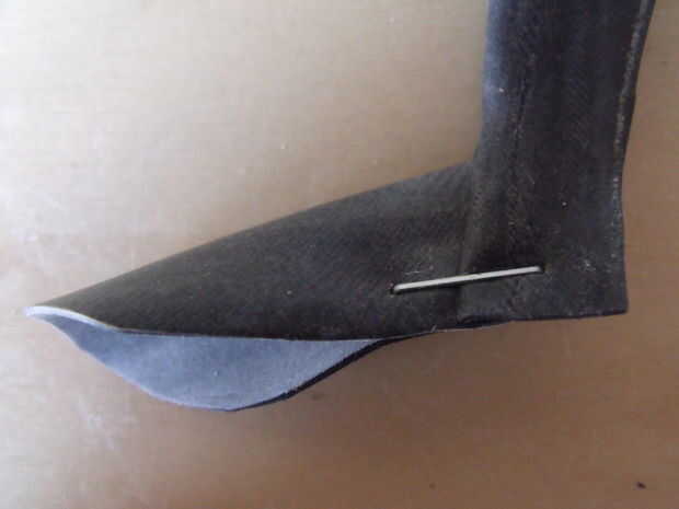 Fije la parte superior de la pierna entre las capas del cuerpo. Si coloca la parte delantera del cuerpo en el centro y cubierta en ambos el lado con la parte trasera será la pierna en una posición perfecta. Asegúrelo con una grapa.