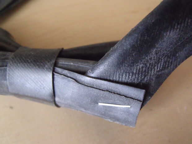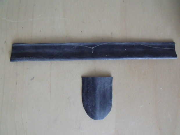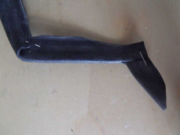 Una pierna es más larga que un brazo en la realidad, pero para nuestro propósito hará 16 cm. Cortar de un pedazo de neumático y cortar longitudinalmente en dos mitades. Dibujar la forma de la pierna (ver imagen) o si es un modelo con los tradicionales pantalones dejan como es. Hacer un pequeño corte en la rodilla y doblarla. asegúrelo con la grapadora. El modelo puede necesitar una fuerte curva de la rodilla, un poco de curva o recta. Y la mayoría de la forma del tiempo de izquierda y derecha serán diferentes. Cortar dos pies, 4,5 cm de largo. Hacer un poco de corte en el doblez en la parte inferior de la pierna y coloque un pie doblado doble.