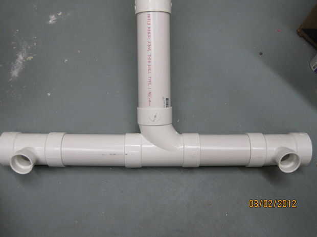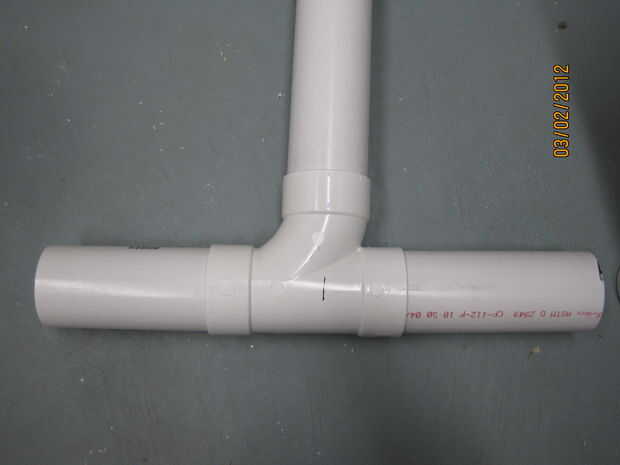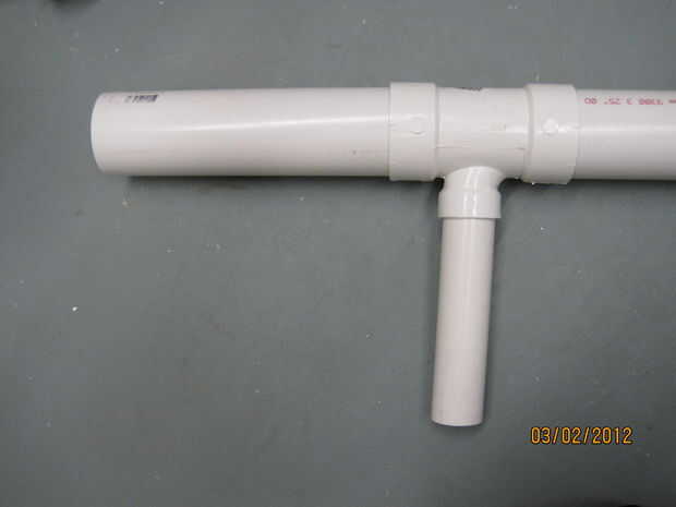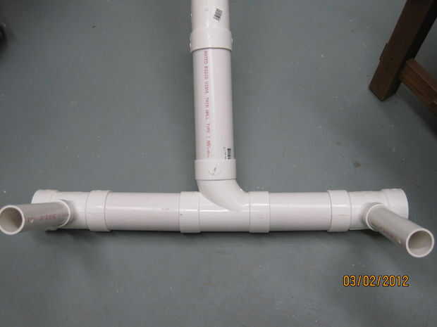 Tomar 27" trozo de PVC de 3" de largo y poner la tapa del extremo no perforadas de 3" en el extremo más cercano a los orificios que ha perforado anteriormente. Luego, tomar un 3 "X 3" X 1-1/2" PVC reducción de tee y empuje en el otro extremo de la 27" larga pieza. Pulse 8" largo, 1-1/2" pieza que no tiene los agujeros perforados en él y presione en el 1-1/2" de apertura en el tee. Se trata de la manija para el arco de nieve. A continuación, tome 12" largo 3" pieza de PVC y presione en los otros 3" de apertura en el tee reducción. Tomar la 3 "X 3" X 3 "tee sanitaria y presione la parte inferior de la t en el otro extremo de 12" largo pedazo de PVC. Porque la t sanitaria es compensada, las 2 piezas de esa rama de la t son longitudes diferentes para mantener la t equilibrada en ambos lados para que el nieve-arco disparará directamente. El lado de la t sanitaria más cercano a donde la t se ramifica al cañón largo del arco, puso el 8" largo trozo de PVC de 3". En el otro lado de la t, poner 9" largo trozo de PVC de 3". Tomar los dos restantes 3 "X 3" X 1-1/2" reductivos y ponerlos en los lados opuestos de la t, asegurándose de que ambos lados son imágenes de espejo uno del otro para asegurarse de que la nieve arco disparará directamente. Por último, presione los dos restantes 8" largos trozos de 1-1/2" PVC con agujeros perforaron en ellas en las aberturas de 1-1/2" a las tes de reducción con los orificios frente hacia la salida del centro. Este paso suena complejo, pero es bastante fácil si prestar atención y seguir las fotos de arriba.