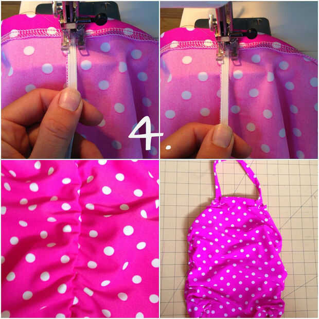 - Vuelva el traje y se reúnen los lados del traje de baño. Que vas a hacer esto de coser y tirando un 10" pieza de elástico a cada lado del bañador, hasta llegar a la parte inferior de 1/4". Cortar el elástico exceso si usted tiene cualquiera. Me gusta un apretado se reúnen, entonces tenía alrededor de una pulgada que se cortó.