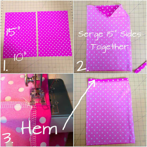 Para hacer la blusa (1) corte dos piezas, serge (2) los lados de las piezas, (3) dobladillo de la parte superior de la pieza y luego (4) se reúnen (o ruche) los lados.