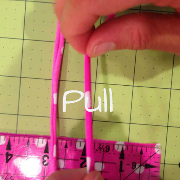 Corte una tira larga delgada de material de desecho (1/4" a 1/2" de ancho y 18" de largo o así) a lo largo del borde de orillo hacer algunos arcos. Una vez cortadas, tire de la tira para enrollamiento de la tela. Si se corta el material de una manera diferente, el material de rizos al revés, así que asegúrese de rizos correctamente cortando a lo largo del borde largo de la orilla.