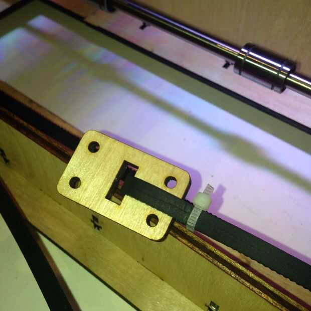 Una vez el paso a paso con el zip de polea GT2 16T atar un extremo de la correa de GT2 al láser de corte parte como se muestra. Montar al tensor de la correa y correr la correa alrededor de la polea y capturar el cojinete. ajustada por el cinturón tan apretado como sea posible sin tensión pernos insertados y ziptie al otro lado de la correa al láser de corte parte. ahora los pernos tensores pueden girarse para comprobar que el cinturón quede apretado.