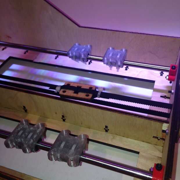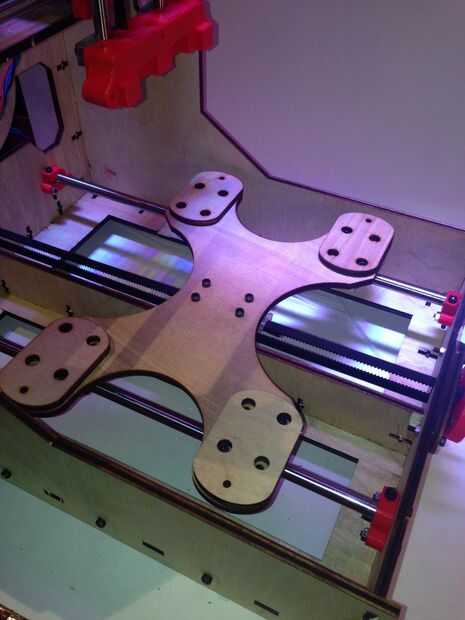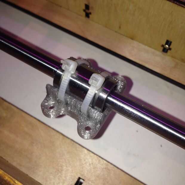 son 4 partes impresos para atar los rodamientos LM8UU para transporte Y cremallera. el primer paso es ziptie todo esto a uno de los rodamientos. Entonces la placa en forma de x puede ser atornillada a cada una de las partes impresas. Hay 4 discos de corte láser que pueden utilizarse para compensar el sacrificio de la cama que usted cortar desde la parte superior de los pernos utiliza sólo para montar el plato en forma de x.