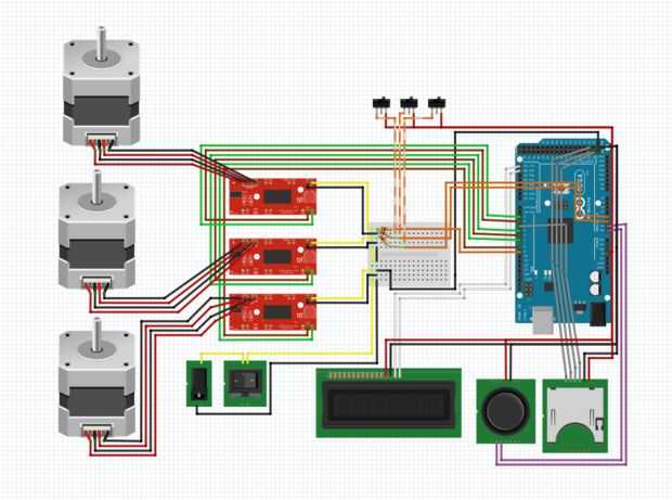La base del circuito es tener los 3 motores PAP controlado por los controladores de fácil que son accionados por una fuente de alimentación externa 12V. Los controladores fácil paso y pernos de dirección conectan al arduino en los pines 2-3, 5-6, 7-8. Los topes tienen pines 9, A3 y A2 con un pull-down resistor tiende un puente sobre a tierra. El LCD lleva los pines SDA y SCL para la comunicación I2C y la tarjeta SD tiene pernos de 4, 50, 51 y 52 para la comunicación SPI (https://www.arduino.cc/en/Reference/SPI <-este enlace le ayudará a determinar que la salida en el lector de tarjeta SD va a que pin). Y por último el joystick se conecta a A0 y A1. Hay un montón de conexiones e incluso si su eje no coinciden con la mía puede editar las definiciones de pines en el programa para que coincida con el hardware.