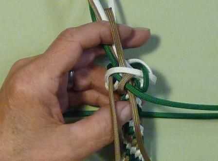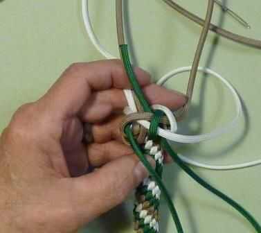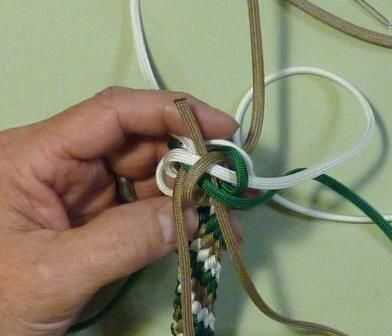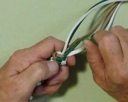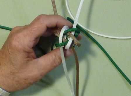 Elegir cualquiera de los cables y en lugar de ir sobre los filamentos de este tiempo, lleve el extremo de la cuerda a través del bucle inmediatamente a la derecha de la cadena que ha elegido utilizar. Este cable irá en dos hebras y hasta a través del centro del nudo.