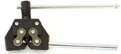Para trabajar eficazmente con cadena, una inversión que vale la pena es un interruptor de cadena de alta calidad. Estas pequeñas cosas cuestan alrededor de $20 a $50 y tienen una manija tornillo ajustable para forzar a los remaches de la cadena y dejarle limpio separar cadena, quitar y agregar enlaces. El tipo que se muestra en la imagen es la más común y generalmente se anuncia para manejar tamaños de cadena #25 y #60. Sin embargo, me parece que son un poco demasiado grandes para pulsar confiablemente #25 cadena remaches - el golpe tiende a soltarse el extremo del remache y deformar las placas, que debilita la cadena.