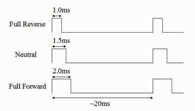 La imagen principal es un gráfico de un pulso de ancho de pulso "comando servo": 1500 microsegundos es neutro o cero señal de velocidad, 1000 microsegundos suele poder unidireccional y 2000 completo potencia el otro. Mientras que servos y controladores de robot responden a las duraciones de pulso como se indica, un controlador de avión típico es unidireccional. El más común "por defecto" es 1000uS como velocidad cero y 2000uS como máxima velocidad, o algo parecido a ese rango. Por supuesto, los CES pueden calibrarse para aceptar diferentes puntos finales en la voluntad, por lo que esta distinción es sobre todo inconsecuente.