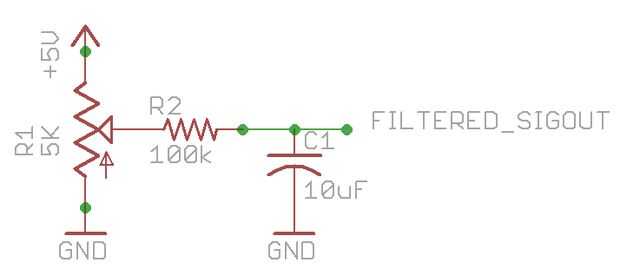 No, realmente, eso es todo. Por lo que en el ejemplo, un resistor de 100K y un capacitor de 10uF junto forman un filtro que tiene un tiempo de subida de 1 segundo - lo que significa si piso de parada (como usted no debería hacer de todos modos, a la derecha? ) señal tarda 1 segundo para alcanzar el 63% (el umbral estándar definido para este circuito). Cierto tiempo de adaptación se define como el tiempo demora la salida llegar a más de 90% del valor final y está generalmente aceptado ser 3 constantes de tiempo (3 * T). Usted puede ajustar el R y C valores a alcanzar sin embargo rápidamente un filtro que desee.