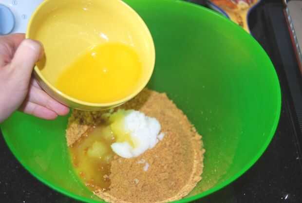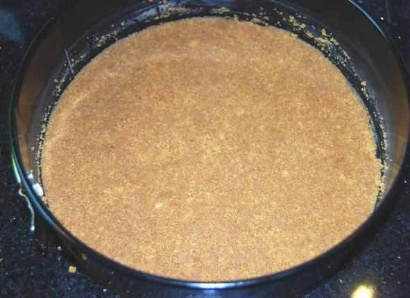Presione las migajas uniformemente sobre el fondo de la cacerola de la forma de resorte. Cubra y refrigere mientras haces el relleno.