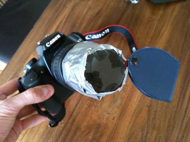 Enrollar el papel y hacer un tubo (acerca de 2 pulgadas/5 centímetro largo) fuera de lo que cabe encima de su lente normal. Asegúrese de que el otro extremo es lo suficientemente grande para la lupa. Pegarlo con la cinta y poner la lupa en la parte superior. Pegar todo encima de su lente normal con la cinta adhesiva. Asegúrese de que está siendo capaz de ajustar la distancia focal del objetivo normal, así que la cinta con cuidado.