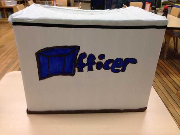 Dibujamos un logo, lo explorado y utiliza un láser de corte para hacer una plantilla. Luego, pintamos la insignia sobre el oficial.