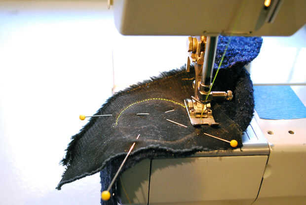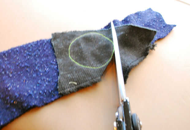 Una vez que he clavado el forro en su lugar, utilizar la máquina de coser para coser por el contorno de tiza. Estoy utilizando una puntada recta para unir a las telas. Después de coserlo, corte mi "iris" a las afueras de la línea de costura.