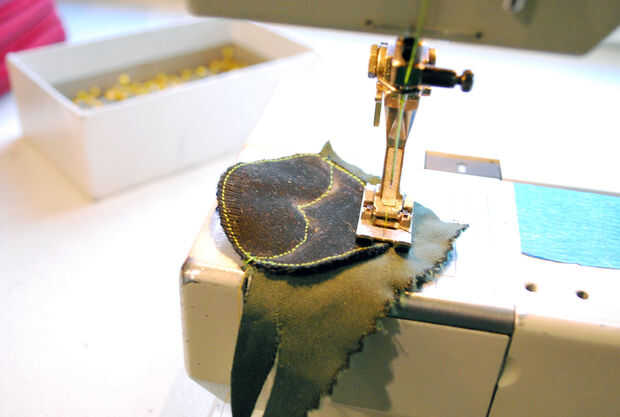 Estoy usando terciopelo verde oscuro como la base del pavo real "ojo". Terciopelo puede ser un dolor real a coser, especialmente cuando está encima de mi abultada tela azul lleno de baches. Por suerte, hay un truco para coser sin problemas.