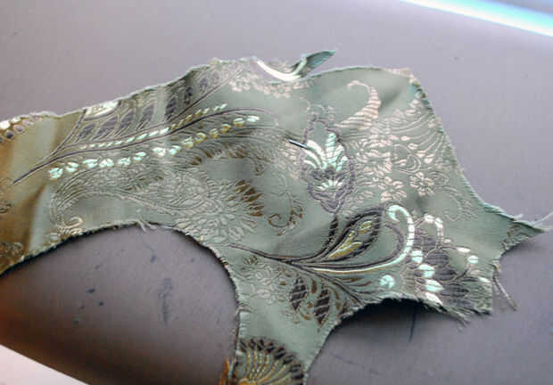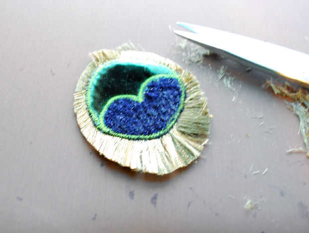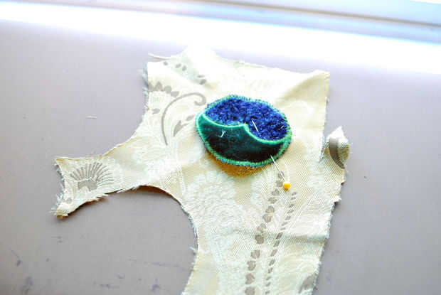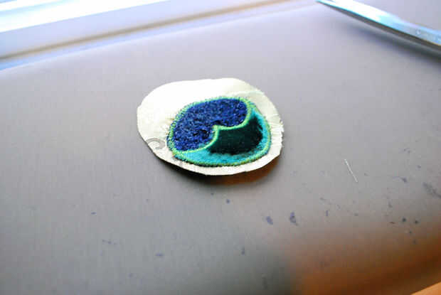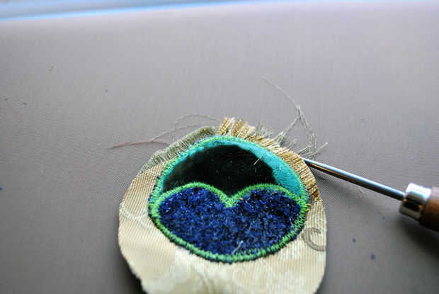 Primero pone hacia fuera el "diafragma" sobre el lado del oro de brocade. Comprobar con las imágenes de plumas de pavo real para tener una idea de las proporciones que quiero, luego dibujarlo en el brocado y cortar mi forma de huevo. I el "iris" en lugar del perno en la base del huevo, cose el iris en forma segura y prepárate empezar a flecos.