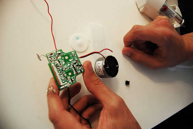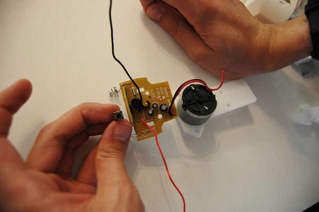 Ponga las baterías en y prueba que cuando se conectan los cables en el extremo expuesto activa el dispensador.
