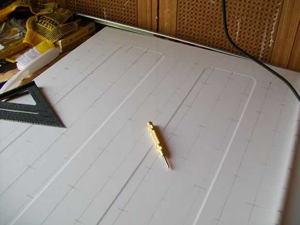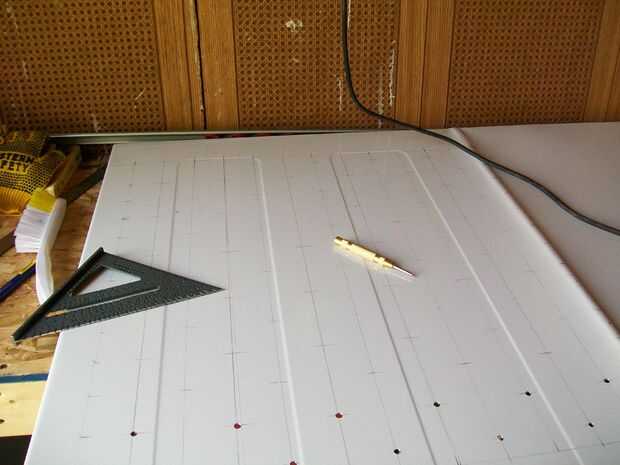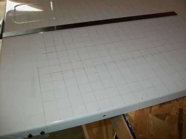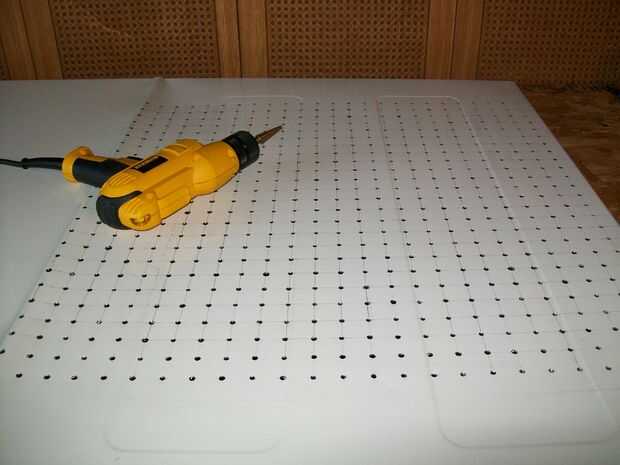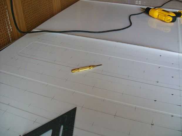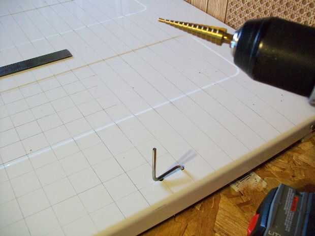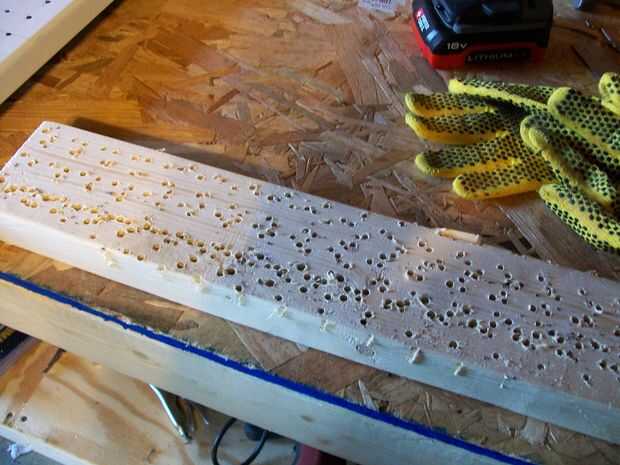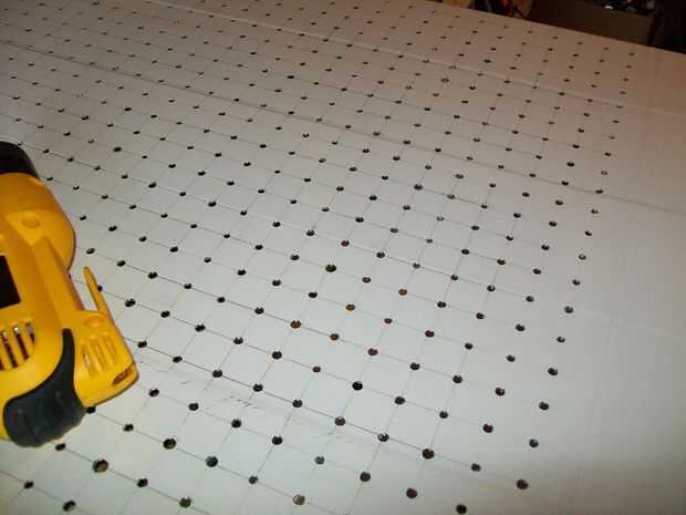 ahora 1/3 de la Junta que planeaba hacer un espacio de 4" entre cada agujero vertical y horizontalmente y después se hacen con el inicio de la marca de la marca entre las filas y columnas como en la foto (no se puede explicar mejor en inglés ya que es no es mi lengua materna)