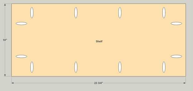 Con su jig de 3/4" acción, perfore agujeros de bolsillo en la parte inferior de los estantes, como se muestra.