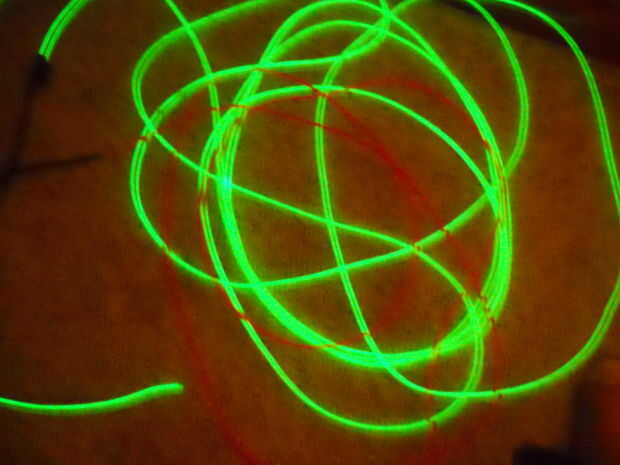 ¿alguna vez utiliza EL alambre, o sintió que sería bueno tener un cable que enciende para arriba, en lugar de costosas cadenas de LED? ¿Por qué algunos que pulso con música? Eso es lo que se para, el órgano de color EL hilo. EL alambre se compone de tres cables. Un cable de gran centro rodeado por una capa de fósforo. Dos cables más pequeños son envuelto alrededor de él y conectados en el extremo del alambre. Un extremo se deja abierto, el otro conectado a la fuente de alimentación. Cuando acerca de 120VAC a unos pocos kHz se ejecuta a través de él, el fósforo se ilumina. Este es un problema para los órganos de color tradicional, ya que utilizan ya sea bajo voltaje de CC para LEDs, o baja frecuencia AC para las luces incandescentes. Este proyecto logra la reacción de música, alta frecuencia y alto voltaje problemas con un dispositivo pequeño. La usé para un traje de holloween de estilo tron que reacciona a la música.