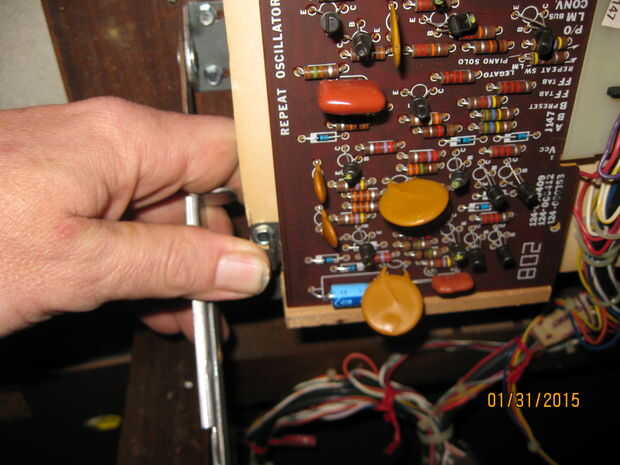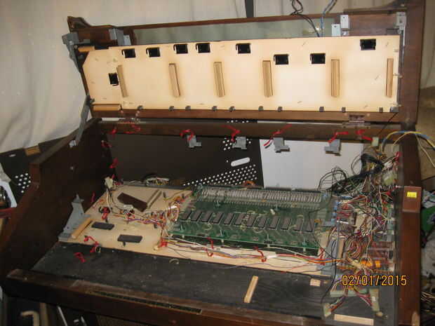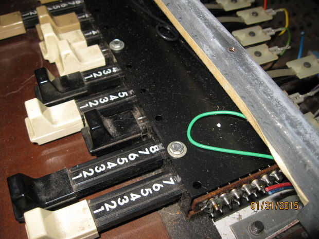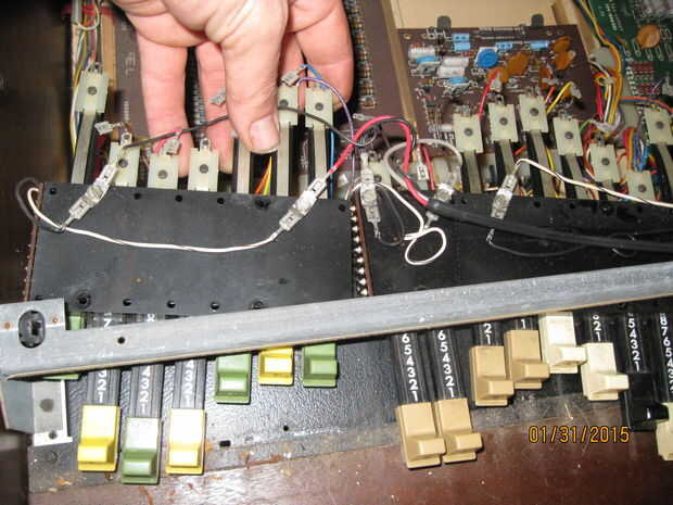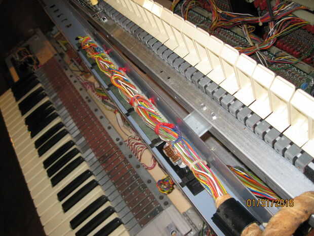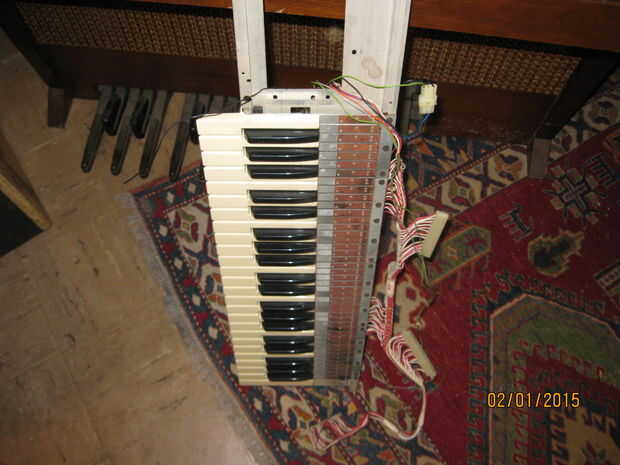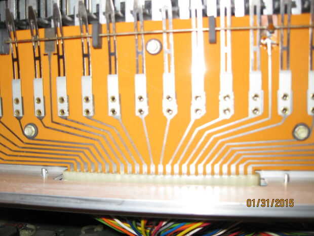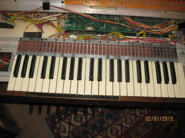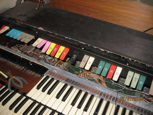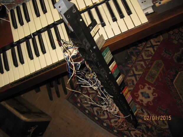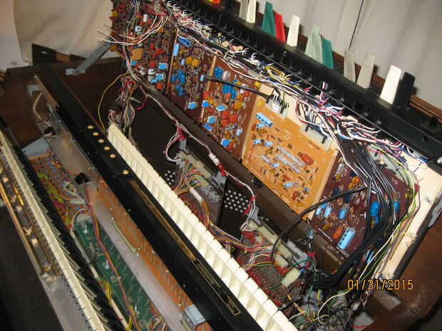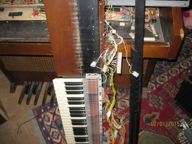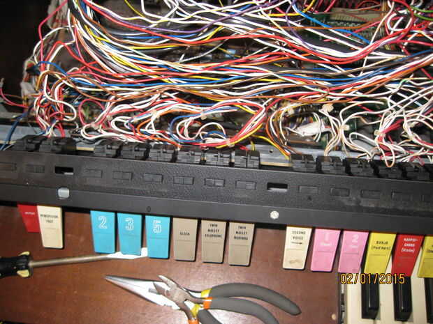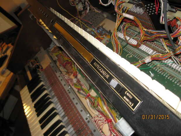 Mientras estaba quitando los teclados me di cuenta de algo interesante. Una de las piezas tenía una tira color oro y un toggle switch rotulado 'arpegiador'. Cuando el órgano aún estaba trabajando había movido de un tirón el interruptor pero no notado ningún efecto sobre el sonido de los teclados. Pensé que era una conexión floja y piensa nada más de él. Cuando estaba quitando el panel con la pieza de adorno de oro me ha sorprendido ver un tallo grande de cables conectados a la espalda como un nervio masiva de los ganglios. Una inspección más cercana reveló que estaban todos conectados a la franja de oro y cableados en el tablero de la voz principal en correlación con las teclas en el teclado inferior. Supongo que la Faja de oro fue similar a la franja táctil en las varias Suzuki, permitiendo al jugador 'rasgueo' el instrumento. Tengo curiosidad por lo que esto sonaba como ahora. Me enseñe a RTFM! (O por lo menos GoogleTFM)