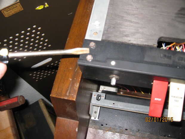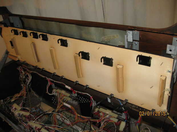 A continuación retirar las piezas de adorno desde el teclado y quita el montaje del enganche. Básicamente estos están resbalando ollas montadas en una fila para imitar el formato de barras de armónicos de órgano tradicional. Con el ajuste y tirantes quitados saqué los tornillos de liberación de la teclado desde la parte inferior de la mesa del órgano. Esto permitió que los teclados hacer pivotar hasta dar acceso a los circuitos por debajo. Se me quitan las piezas de molduras de madera de los marcos de aluminio teclado. Quité los teclados quitando los tornillos de conexión de la bisagra del cuerpo órgano principal. Había trazado cuidadosamente el arnés de cableado de teclado a donde enchufar en la placa de la voz principal y había desenchufado desde allí.