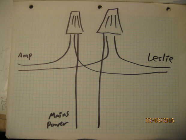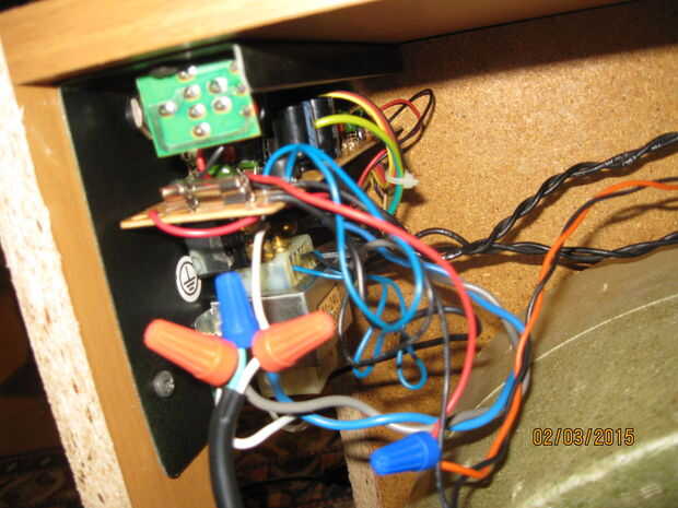 El paso final fue para reunir todo el poder. Había atado a los cables positivo desde el cable de alimentación, el amplificador y el Leslie con una tuerca de alambre y me hizo lo mismo para los terrenos de la común. I empalmar el cable a tierra del cable eléctrico al chasis del amplificador y había sustituido el panel frontal del amplificador. Es él - ahora es el momento para agarrar una guitarra.