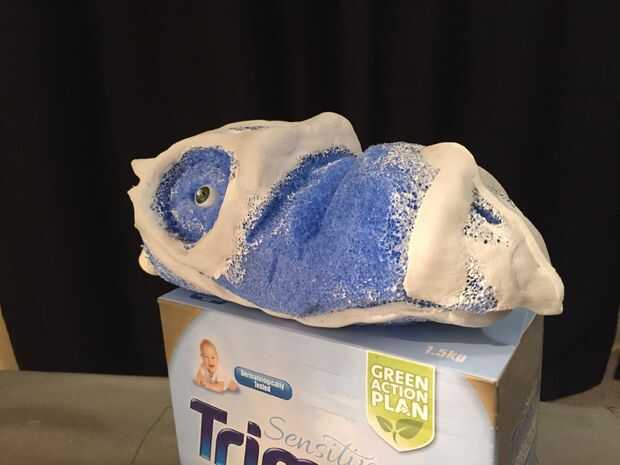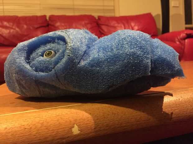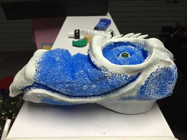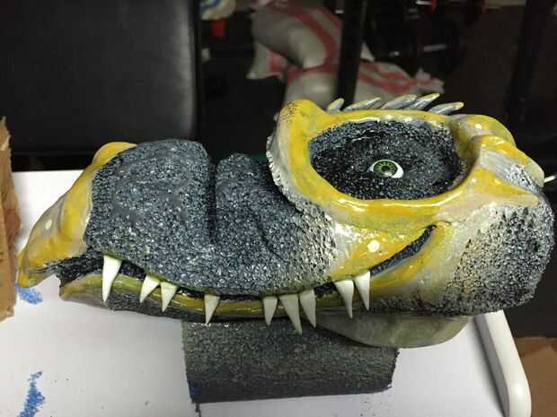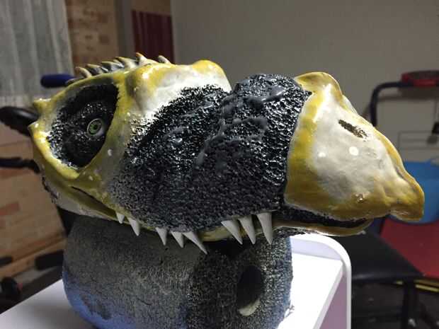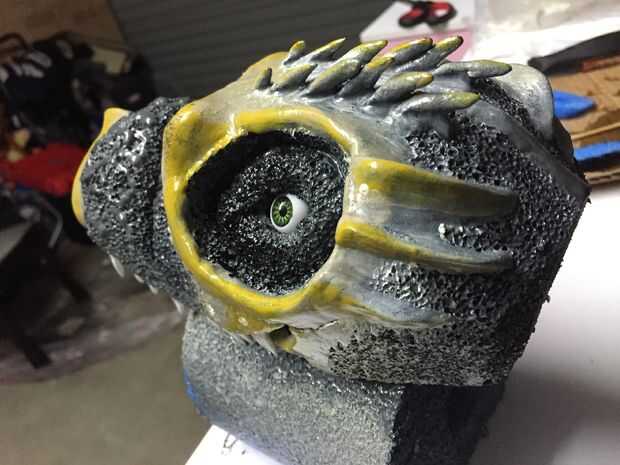 La cabeza fue construida de una pieza de la mollera de la piscina. He tallado la forma básica, usando un cuchillo stanley y coloca un par de ojos de muñecos en los zócalos del ojo. Entonces hizo el resto de la cabeza usando arcilla de modelaje que luego tomó alrededor de una semana a completamente secos. Me agrega algún detalle extra a la piel con resina y agregado de dientes hechos de arcilla. Luego pinté la cabeza con algunos de la pintura de acrílico de los niños.