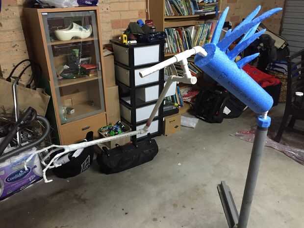 Para la base utilicé un viejo paragüero. Se me ocurrió la forma del cuerpo con los tubos de PVC. Como se puede ver en las fotos la primera forma que se me ocurrió era inestable, por lo que se me ocurrió un mejor diseño que se puede ver en la última foto. Empujé un tallarín de piscina en el Paragüero por lo que pude del hilo de rosca en él un tubo de PVC. Cuando era feliz pinté la parte de atrás, tenía la intención de los picos que asoman a través de su ropa.