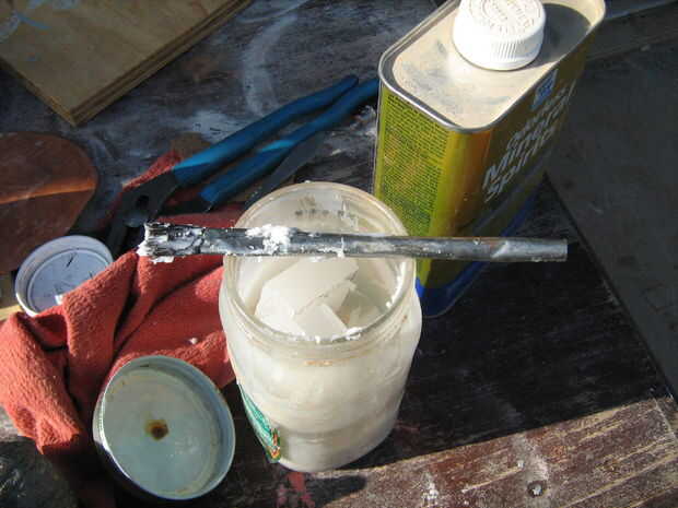 en la jarra de vidrio, disolver 1/2 de la caja de parafina. este tipo viene en 4 tortas. Cortado en algunas piezas de playas y algo de él en afeitado demasiado, cuanto más pequeño mejor. no es necesario embalar en apretado...