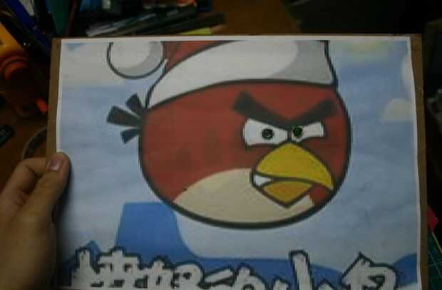 使用再生的密度板, 并在表面贴上愤怒的小鸟的贴纸, 并在眼睛处打洞, 装上led