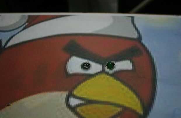 El uso de la regeneración de tablero de densidad y la superficie con pegatinas de pájaros enojados y los agujeros en el ojo, con LED