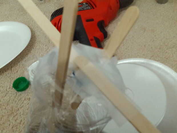 2. Inserte un palillo de arte en cada orificio sobre a medio camino a través. (2/4 palitos usados hasta ahora.)