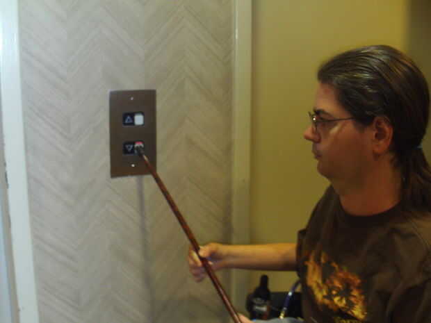 Mi primera encarnación de la palanca del ascensor consistió en simplemente un palo taco cortado a una longitud cómoda con un dedal de goma utilizado para coser pegada en el final con una banda elástica. Esto funcionó bastante bien. Me permitió llegar fácilmente y pulse el botón del ascensor. Esto funcionó bien para mí a través de la High School secundaria.
