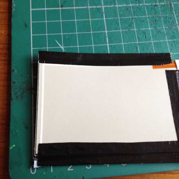 Tome la cinta y fijar a la estructura de cartón por lo que se ejecuta al ras con el borde interno y sujeta la hoja del doblar la cinta en medio por lo que deja un borde de cinta de celo alrededor de los bordes de la hoja del marco/EL.