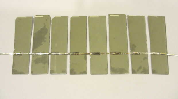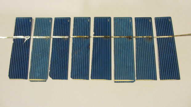 Para este paso, yo estoy cableado ocho celdas en una configuración de serie para aumentar el voltaje del panel. Al final, este panel fuente de 8 voltios.