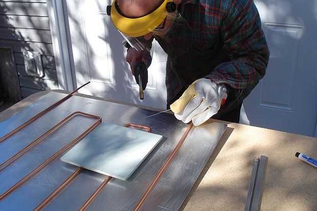 Foto 3: Aquí mi amigo Martin es soldar el tubo y la placa. Tenga en cuenta que trabajamos fuera, había una buena brisa y utilizamos algún tipo de protección!