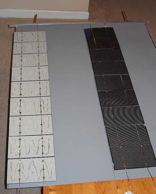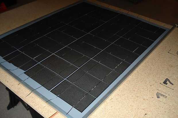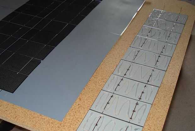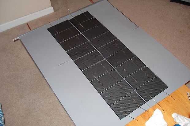 El aluminio debe cubrirse con un aislante eléctrico (yo usé Begquist costo 400, de sil-pad alrededor de $50) porque la parte trasera de las células fotovoltaicas es uno de los está. SIL-pad es un conductor térmico decente demasiado, pero supongo que papel alquitranado habría funcionado demasiado bien y sería mucho más barato! Las células fotovoltaicas son 15 cm x 7,5 cm, y este panel usará 36 células. Compré las células en ebay de rebeccayi0904 (agradable!) en $150 para las 76 células (~1/2 usada de los de este panel). Las células necesitan estar conectados en serie (¿cómo están tus habilidades de soldaduras?) y luego les pegué a lo sil-pad con sellador de silicona. : Cuidado las células PV sólo 0,20 mm de grosor y romperán si se miran demasiadas!