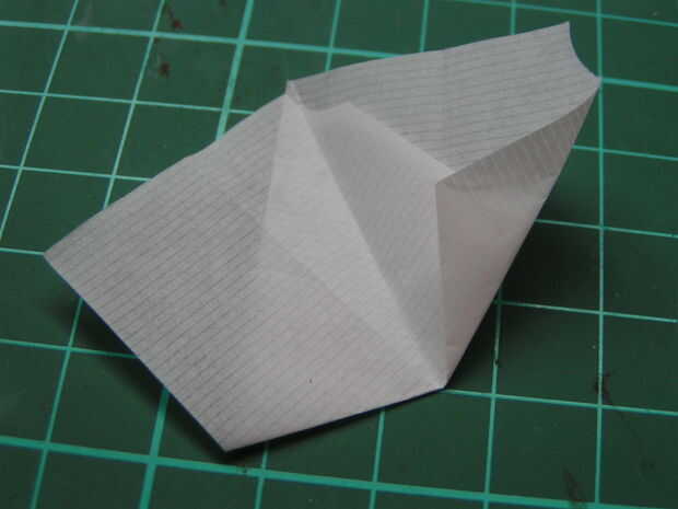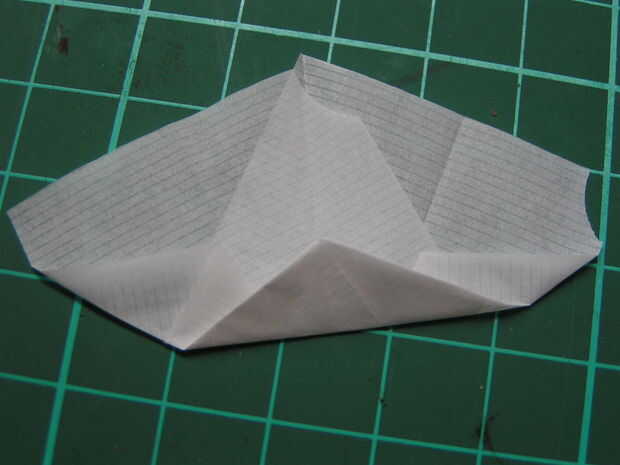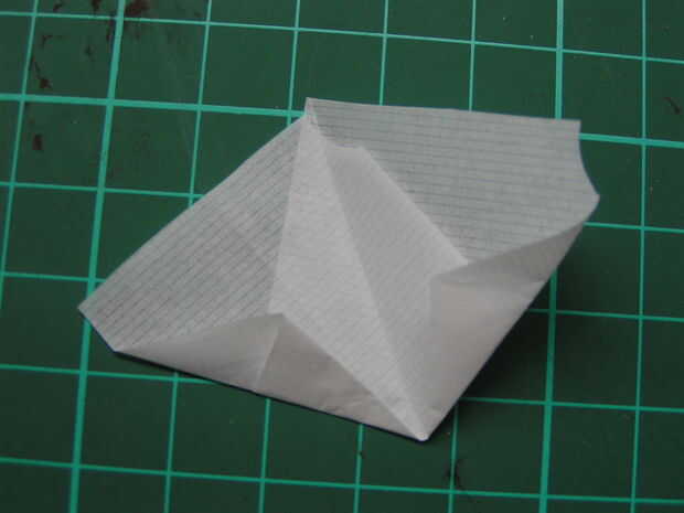Doblar las dos esquinas delanteras hasta satisfacer el pliegue existente. El pliegue en el borde delantero debe alinearse a lo largo del pliegue que hace la V.