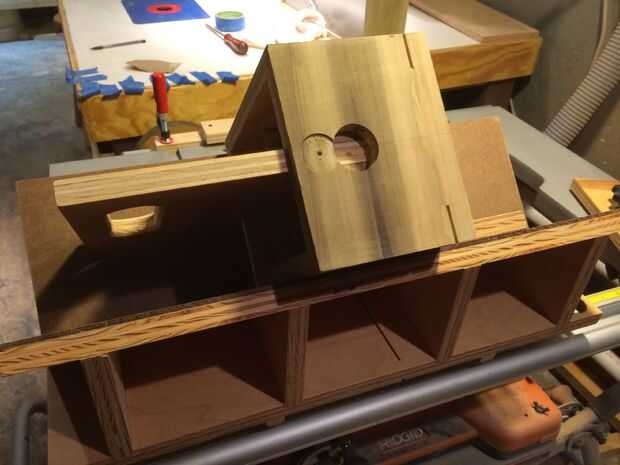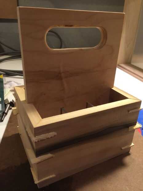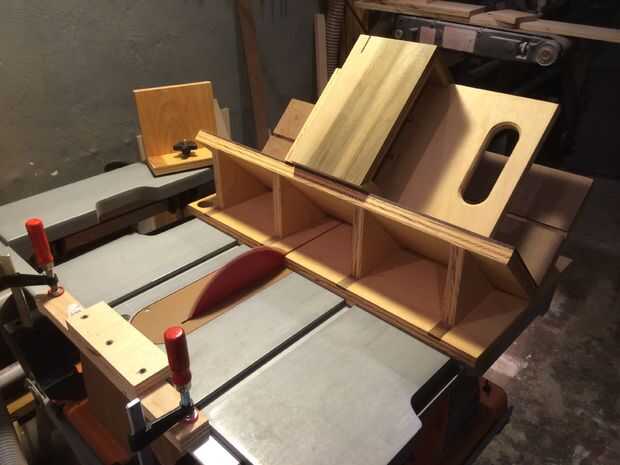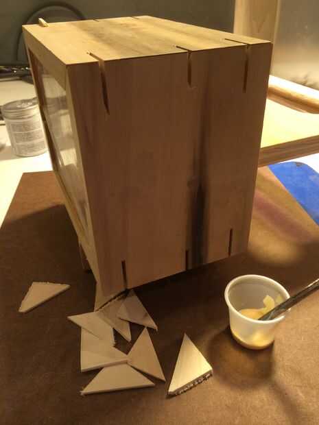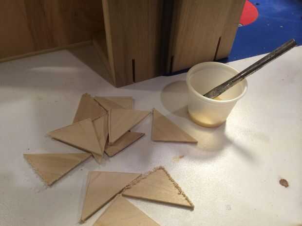 A continuación, quería reforzar estas juntas de inglete con las tiras, por lo que con la ayuda de mi patín de corte de la tira, cortar tres ranuras por esquina. Luego arrancó tiras de 1/8" en la Sierra de mesa y cortar ranuras triangulares en la Sierra de cinta. Pegamento para arriba era simple... sólo un tos del medicamento, plomería ácido pincel, pegamento y algo de paciencia. Fui con colores contrastantes, porque quería mostrar el engranaje.