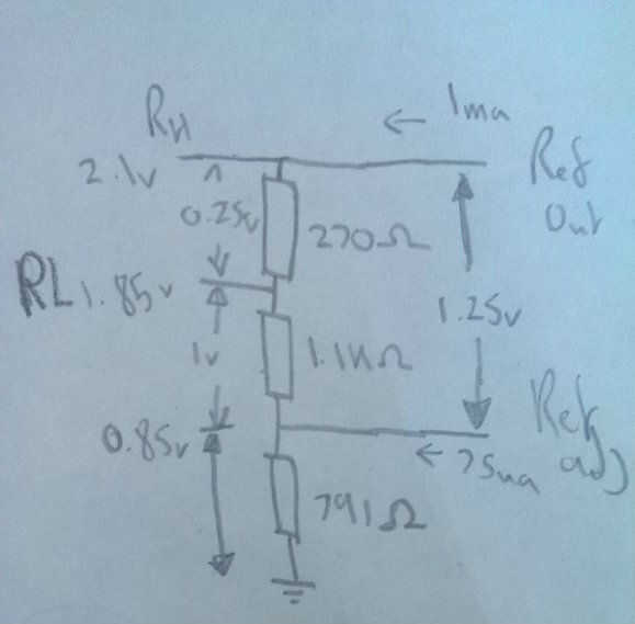 Después de ver el tutorial de Dave, me decidí por algunas de las especificaciones, 4.20v máximo voltaje 3.7v mínimo con sobre LED corriente de 10ma. Luego siguió a través de la matemáticas de Dave y vino para arriba con algunos valores de resistencia (ver segunda foto), suponiendo una división por el divisor 2 resistencia entre el voltaje de la batería y el pin de sentido.