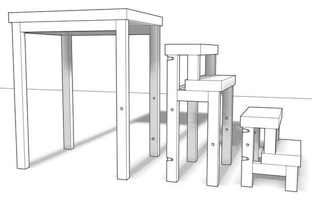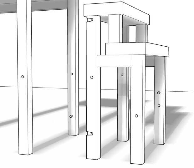 Aquí puedes ver que los tres cuerpos aislaron de uno al otro. Estas piezas tienen que unirse con tres pivotes de acero, a colocarse donde puedes ver los agujeros. Los pequeños cilindros que se ve se pueden hacer de la madera, ya que sólo los pasos en posición cuando está cerrada la escalera, y también actúan como taquillas cuando lo abres, pero en un piso plano no deben hacer ningún esfuerzo.