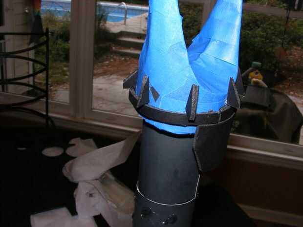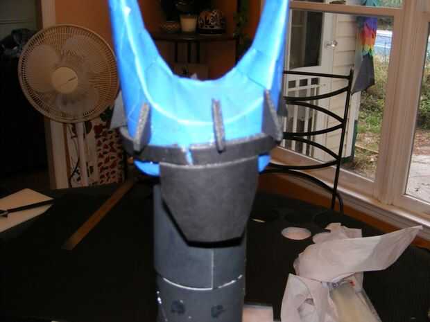 Pronunciar mi grito de guerra: "Proporción ser maldecido!", que ampliar el patrón y un tenedor más grande. Esto fue conectado a un segmento corto de tubo de cartón, luego fleshed hacia fuera con piezas de apoyo laterales azul cinta adhesiva y cartulina en una aproximación razonable de la parte superior de la torre de la película.