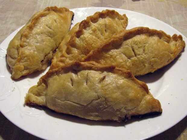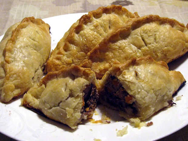 Ahora que la mayoría de los lectores ha afectado el botón back, un poco de historia: empanadas de Cornualles tradicionales (también conocido como tiddy oggy en dialecto de Cornualles) es masa de hojaldre redondo doblado por la mitad y relleno con carne cruda, patata, colinabo (también conocido como un sueco) y cebolla y luego al horno. El Cornish pasty tiene una historia larga e interesante, que se puede leer en la Wikipedia.