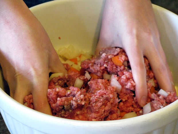 Combinar todos los ingredientes con las manos. Dejar de lado, o refrigerar si usted piensa que usted podría ser un poco lento con perno de balanceo.