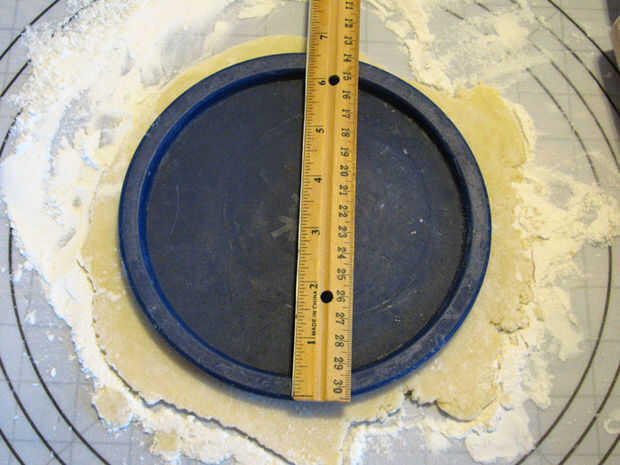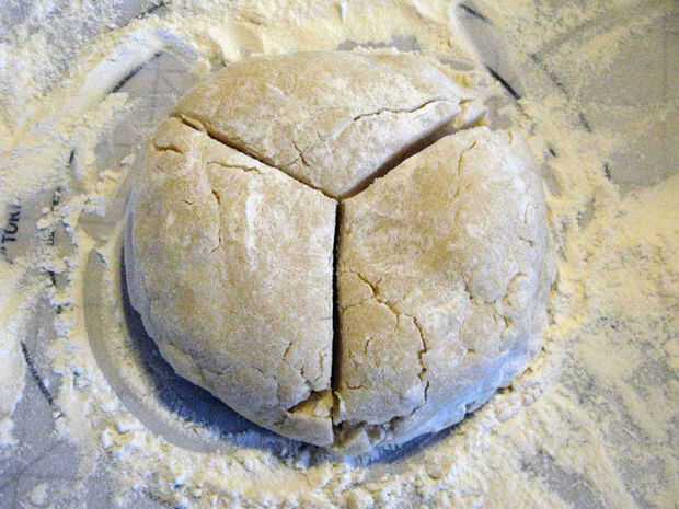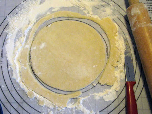 Sacar un disco de la nevera y cortar en tercios. Forman cada tercero en un disco aplanado y harina ligeramente la parte superior. Rollo de cada tercero hacia fuera lo suficiente para que la plantilla se ajusta totalmente encima de la masa. Utilice un cuchillo o cocina Cizallas para cortar alrededor de la plantilla. Guardar las sobras. Hacer lo mismo con el otro disco. Los desechos en un disco aplanado del molde y cortar por la mitad. Hacer dos círculos más como antes.