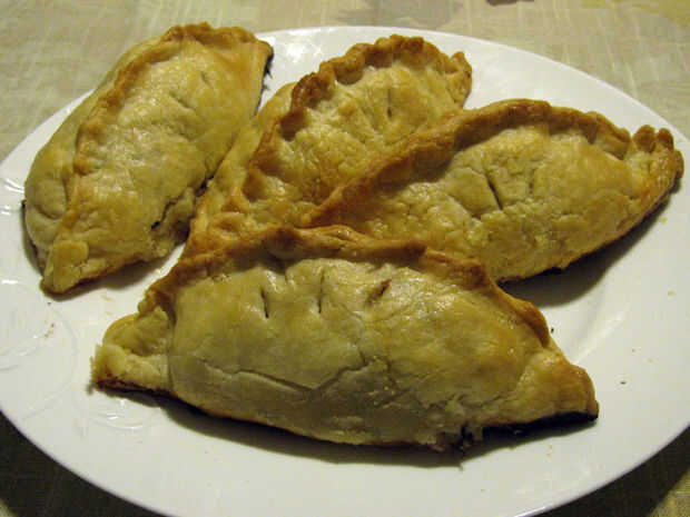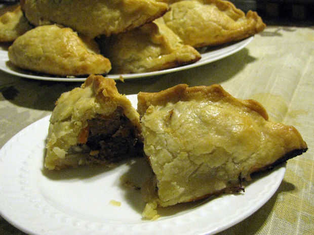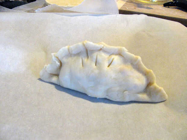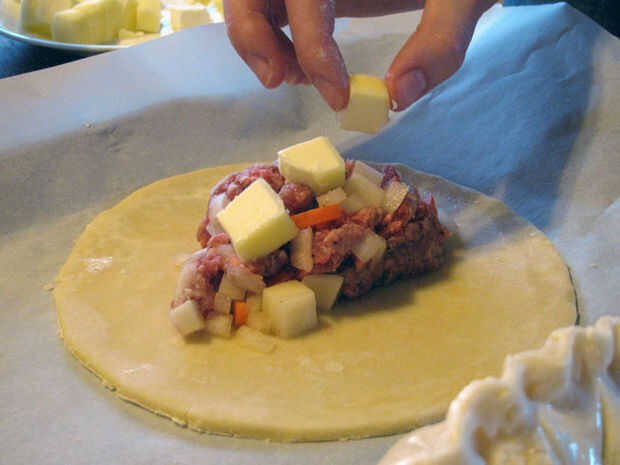 Colocar 2/3 - 3/4 taza de relleno en el centro de cada círculo de masa. Rematar el relleno con tres pedazos de la mantequilla cada. Frote el dedo o un pincel de repostería en el agua y arrástrelo suavemente alrededor del borde de la masa, creando aproximadamente un 1/2" borde. Sellar cada pasty que reúne a los lados y pellizcando cerca y prensado con los dedos o un tenedor. Utilice un cuchillo para crear los orificios de ventilación en la parte superior.